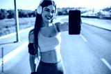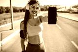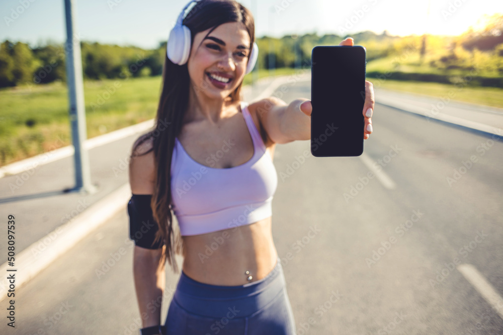 Runner hand using smartphone while resting after running. Front view of a women showing blank smart phone screen in a park. Happy girl wearing headphones showing smart phone blank screen, outdoors.