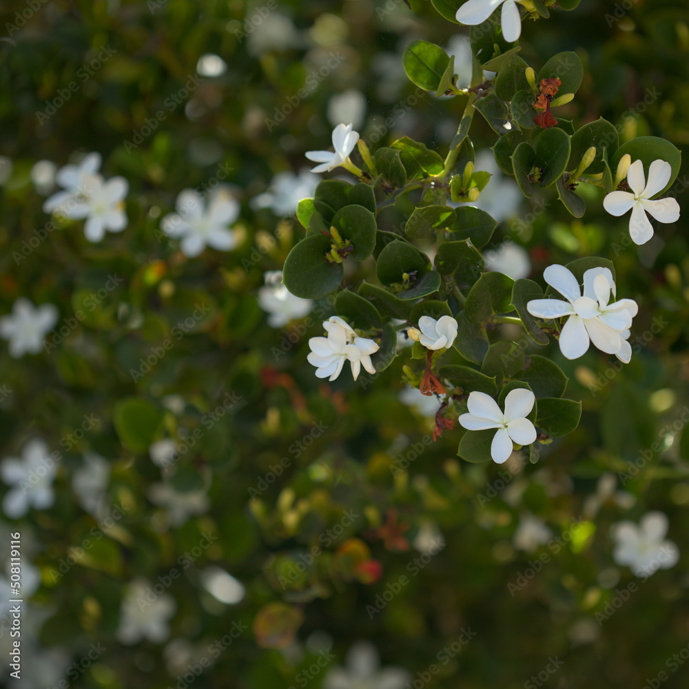White flowers of Carissa macrocarpa, Natal plum, natural macro floral background