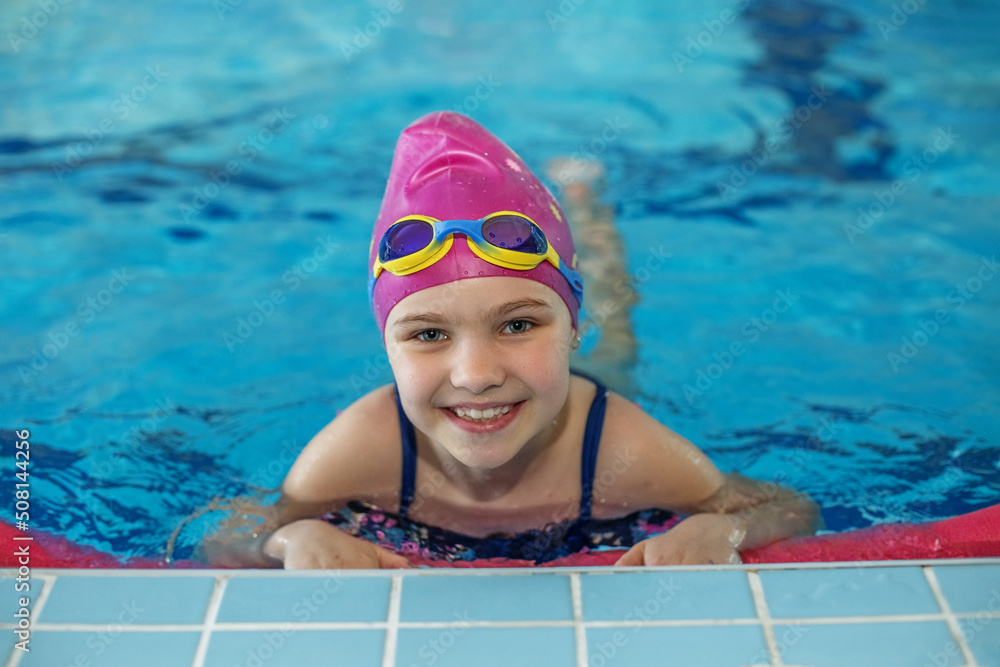 Happy child girl swims in swimming pool. Swim cap and goggles. Training and sports concept.