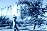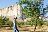A cheerful kid in jeans, a T-shirt and a blue hat is playing in the garden among the apple trees.