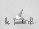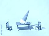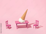 Summer creative layout with ice cream cone upside down on table with pink chairs on pastel pink background. 80s, 90s retro fashion aesthetic summer concept. Minimal pop art refresment idea.