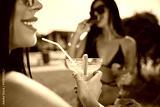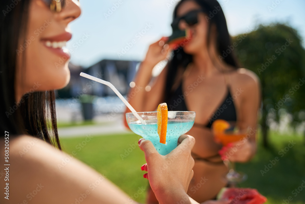 Close up of two pretty girls standing, deinking cocktails, eating watermelon. Brunette young women relaxing near swimming pool, smiling, talking, sunbathing. Concept of youth.