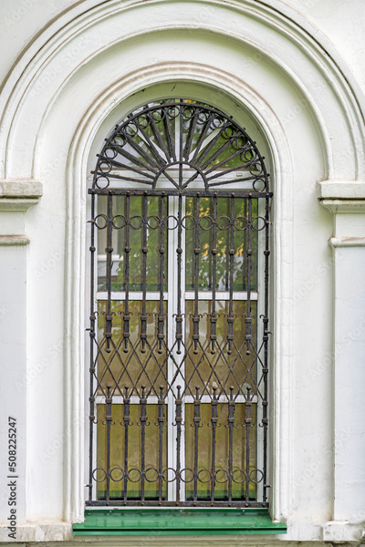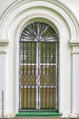 A window with a metal lattice of a historic building on a summer day