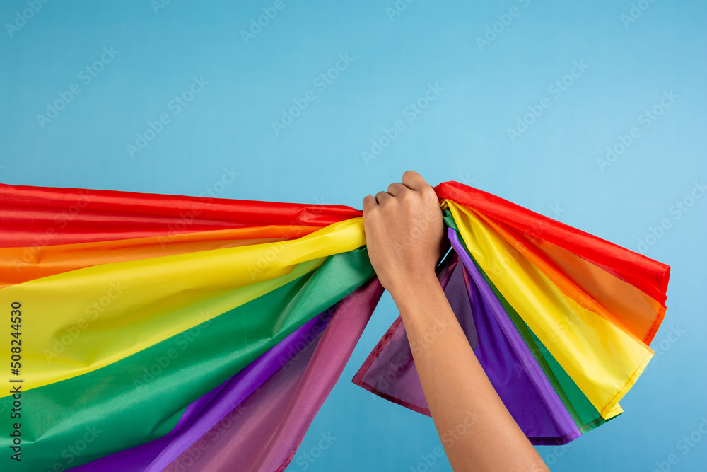 Man's hand holding colorful rainbow flag on blue color background. LGBT concept.