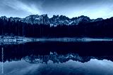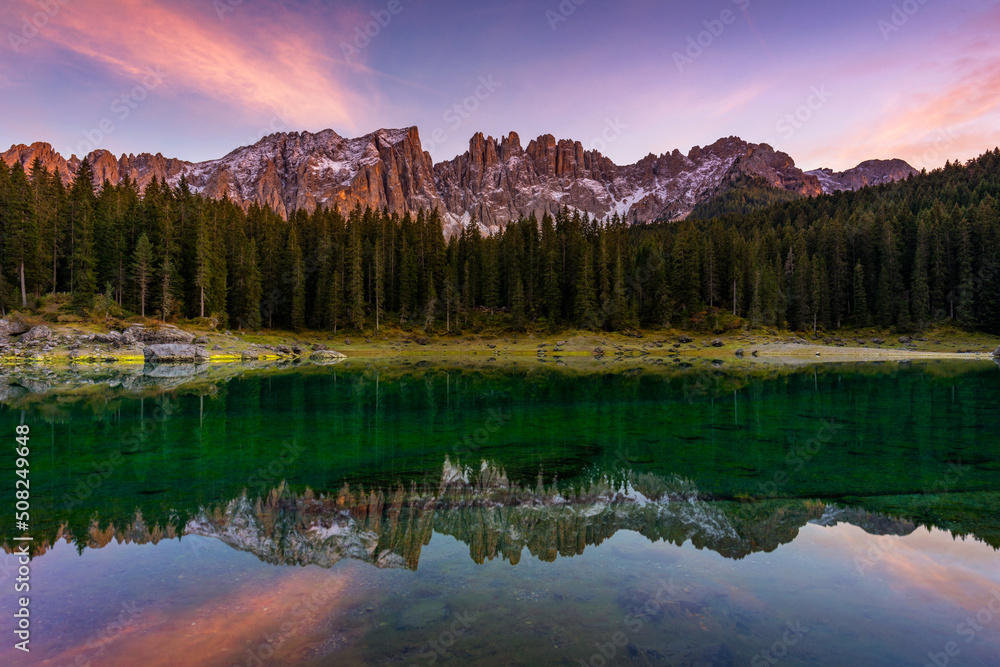 Carezza lake (Lago di Carezza, Karersee) with Mount Latemar, Bolzano province, South tyrol, Italy. Landscape of Lake Carezza or Karersee and Dolomites in background, Nova Levante, Bolzano, Italy.