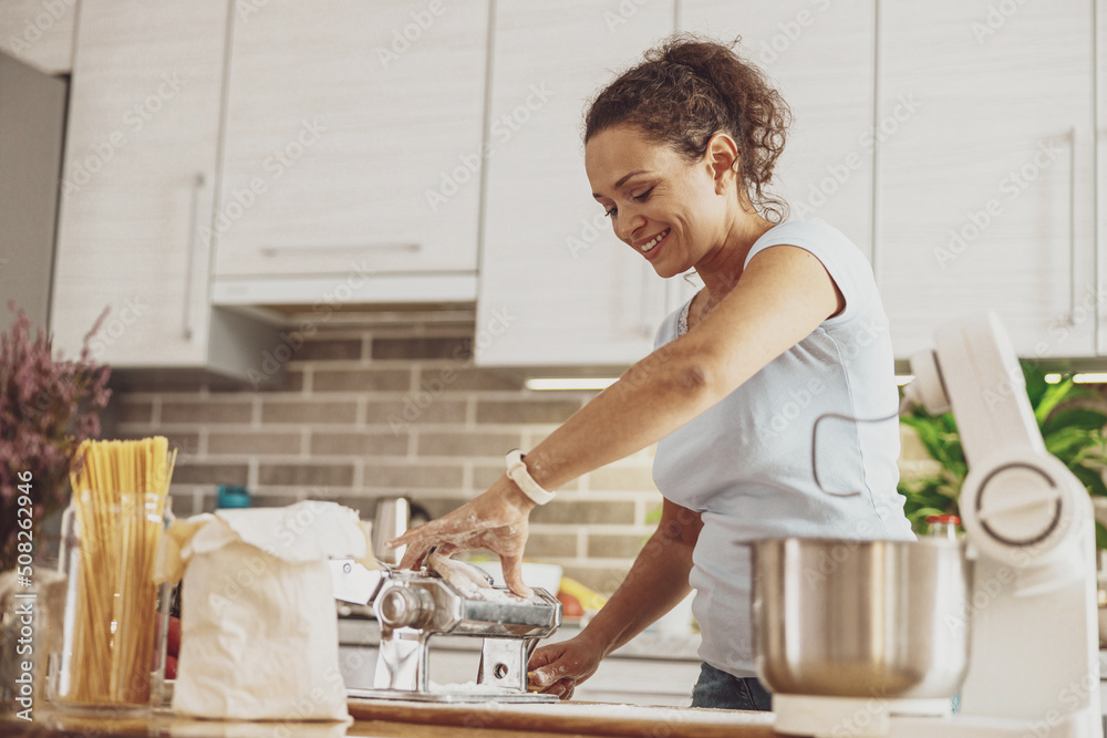 Housewife uses dough mixer and noodle cutter to prepare high-quality noodles