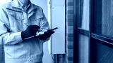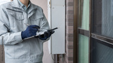 マンションの外壁、窓、網戸、給湯器を点検する作業員|調査・見積りイメージ