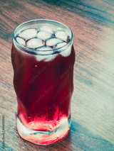 icy red drink in stylish figured glass on wooden bar top