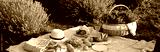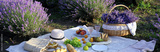 Wicker basket, tasty food and drink for romantic picnic in lavender field
