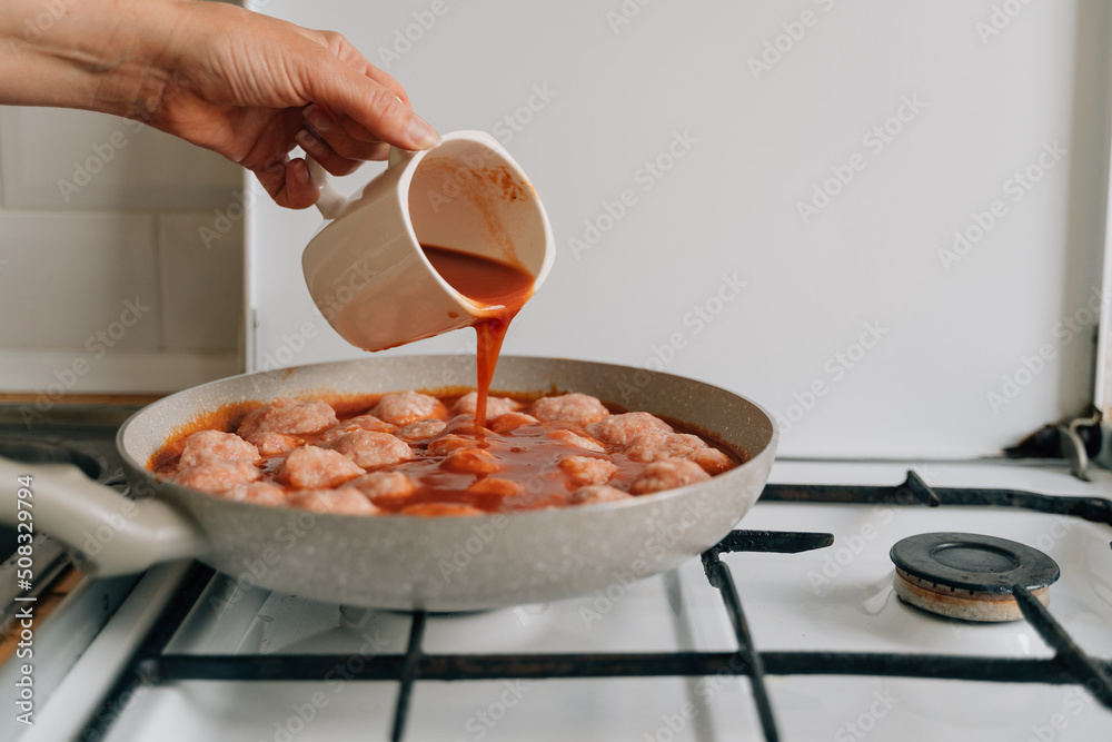 Meatballs cooking process in a pan at home. Beef, chicken and pork meat food recipe in tomato sauce