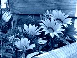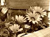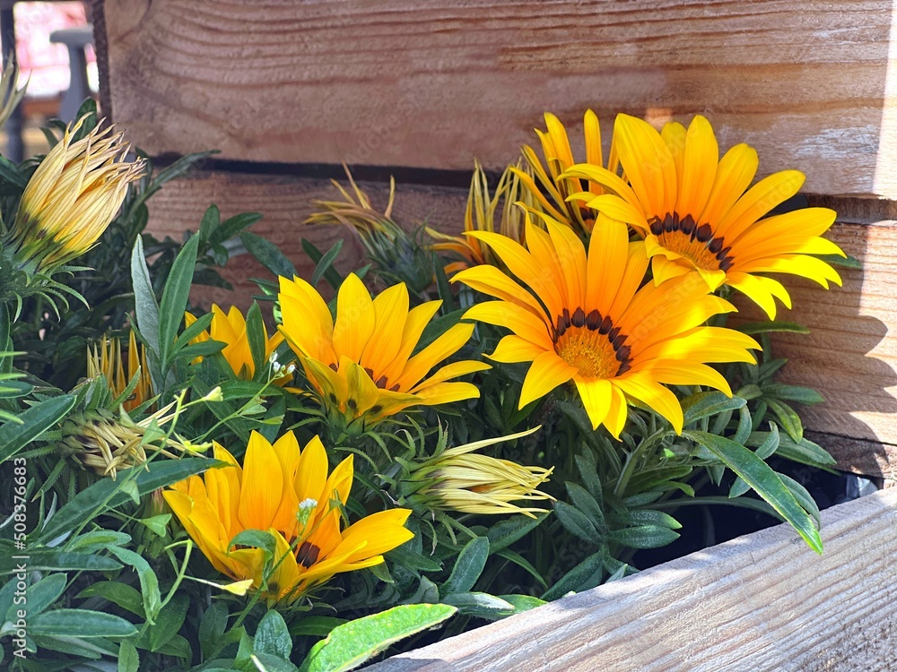 Gazania yellow orange flowers in wooden flower pot. Bright ornamental gazania flowers.