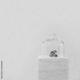 Small flowers under a glass bell on a travertine marble pedestal against pale beige background. Protection and preciousness concept. Spring and summer bloom concept. Wedding invitation card template.
