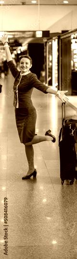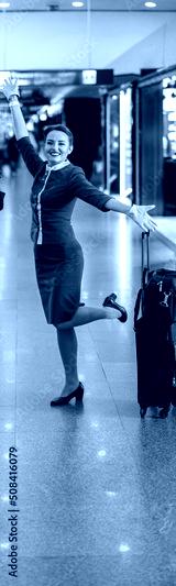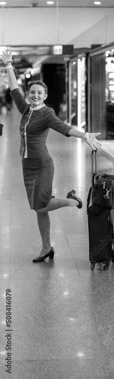 Joyful female flight attendants in aviation air hostess uniform looking at camera and smiling while standing near trolley luggage bags