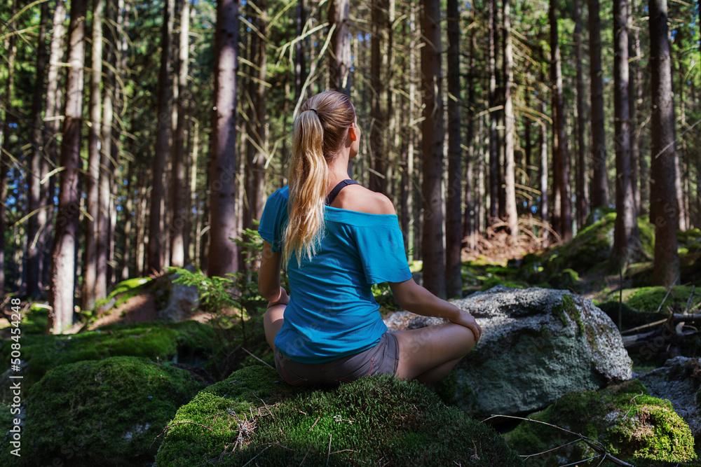 Blond woman sitting in green forest enjoys the silence and beauty of nature.