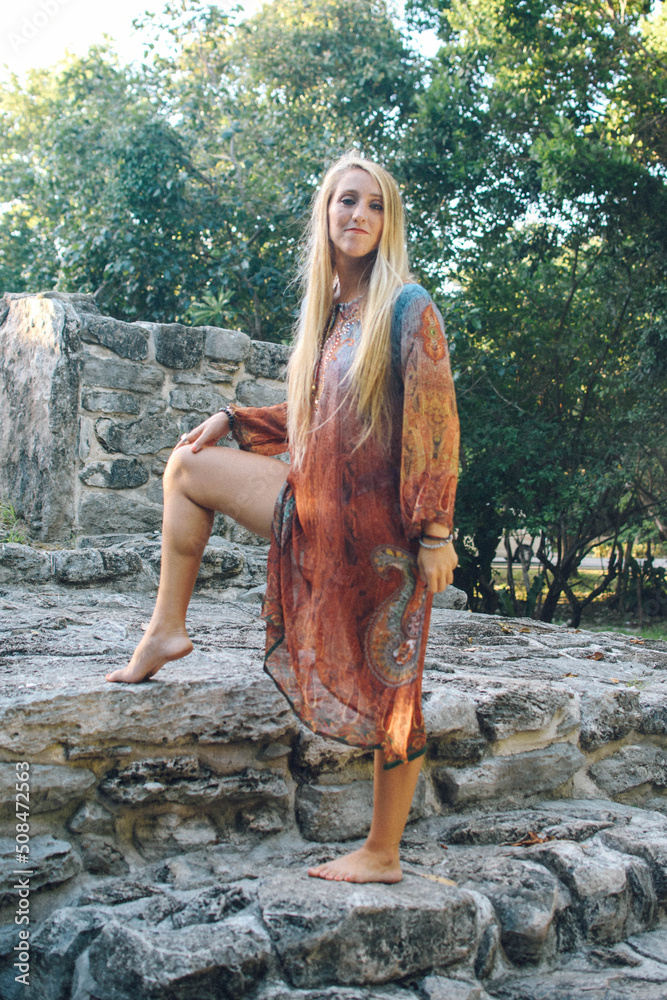 blonde girl posing in ancient ruins in mexico lifestyle concept