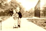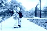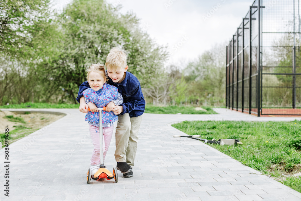 Child boy teaches little sister how to ride a children's scooter. Active rest on playground.