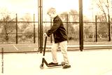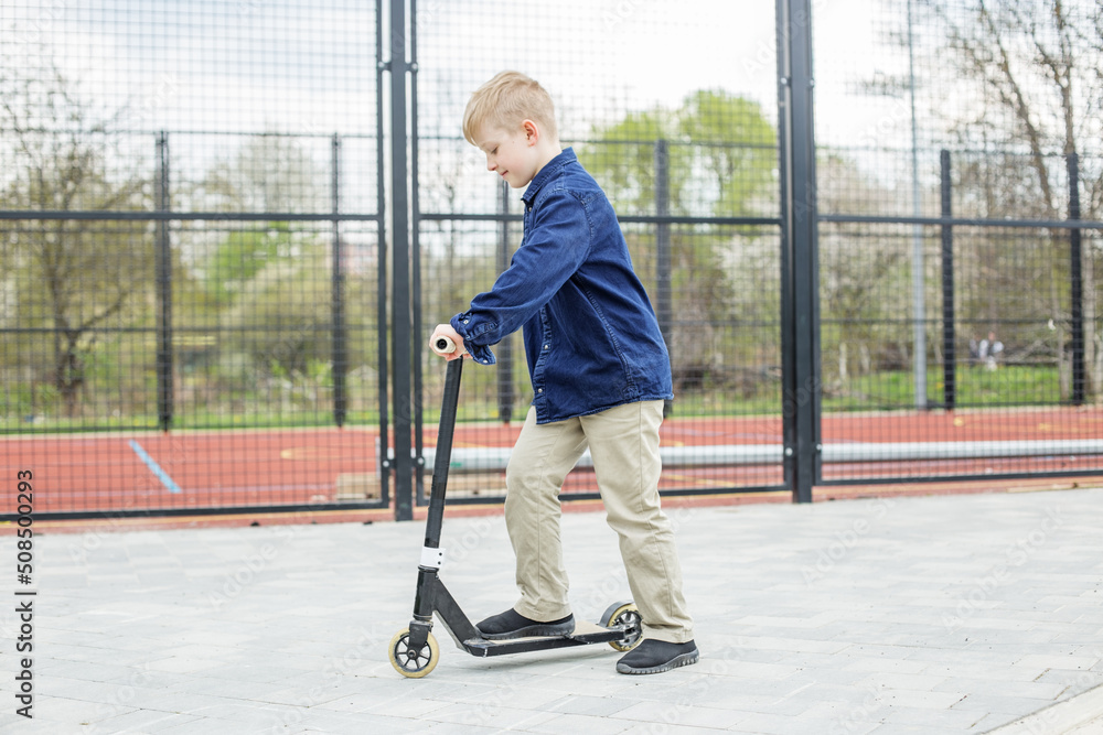 Little blond boy rides scooter. Child plays on sports ground on sunny summer day