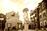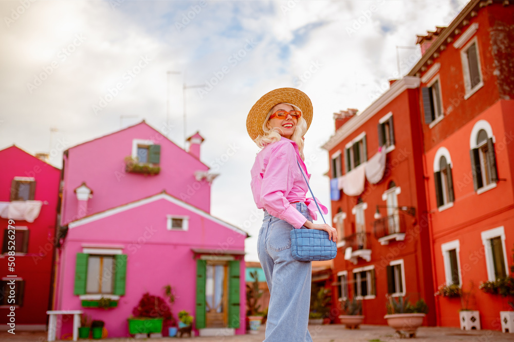 Happy smiling traveler woman posing in street, among colorful houses on Burano island. Girl wearing trendy summer outfit with orange sunglasses, straw hat, pink shirt. Copy, empty space for text