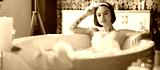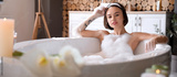 Beautiful young woman taking bath with foam at home