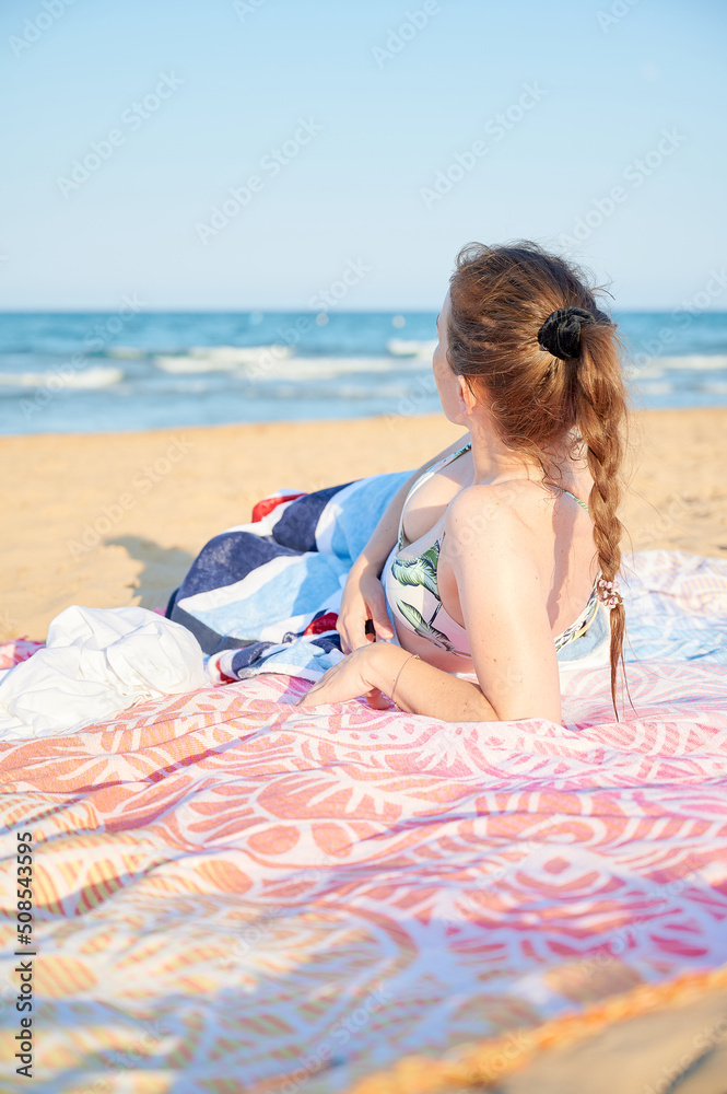 Young adult woman wrapped in a towel enjoys last hours of the day at a calm beach. She is wearing a bikini and lies on a pareo in front of the Mediterranean Sea.