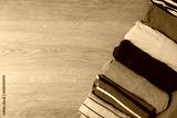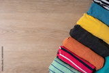 close up of rolled colorful t shirt clothes on wooden table background, travel concept