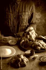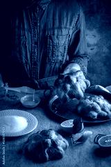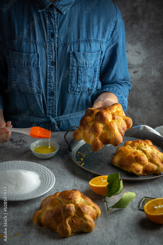 Woman preparing Pan de muertos bread of the dead for Mexican day of the dead