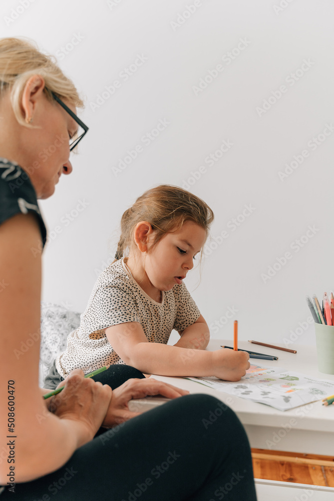 Mature woman granny with grandchild preschool girl drawing together at home.