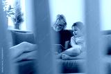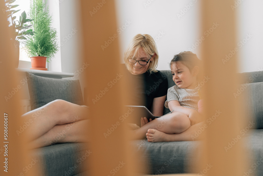 Granny and preschool girl using tablet together at home on the sofa, family togetherness time
