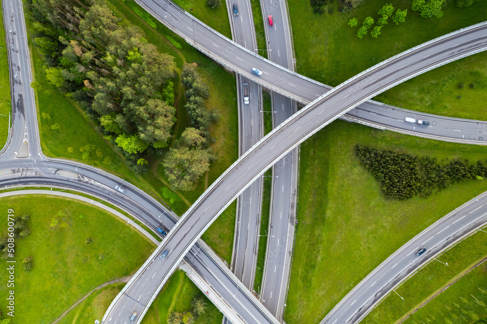 Aerial summer spring sunset view of highway road junction in Vilnius, Lithuania