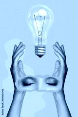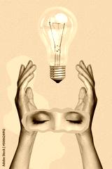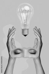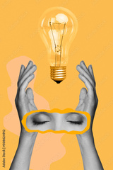 Creative abstract template graphics collage of hands eyes holding high bulb having idea isolated yellow color background