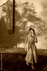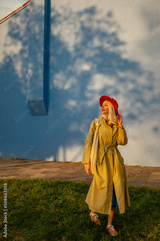 Happy smiling fashionable woman wearing stylish outfit with orange hat, green trench coat, sneakers walking near blue color house
