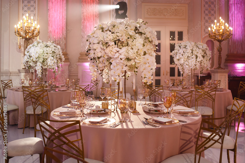 Tables set for wedding or another catered event dinner