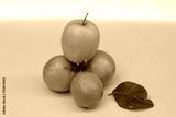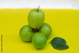 green color apple on top of green lemons on yellow and white background. Concept: Fruit photography. Healthy food.