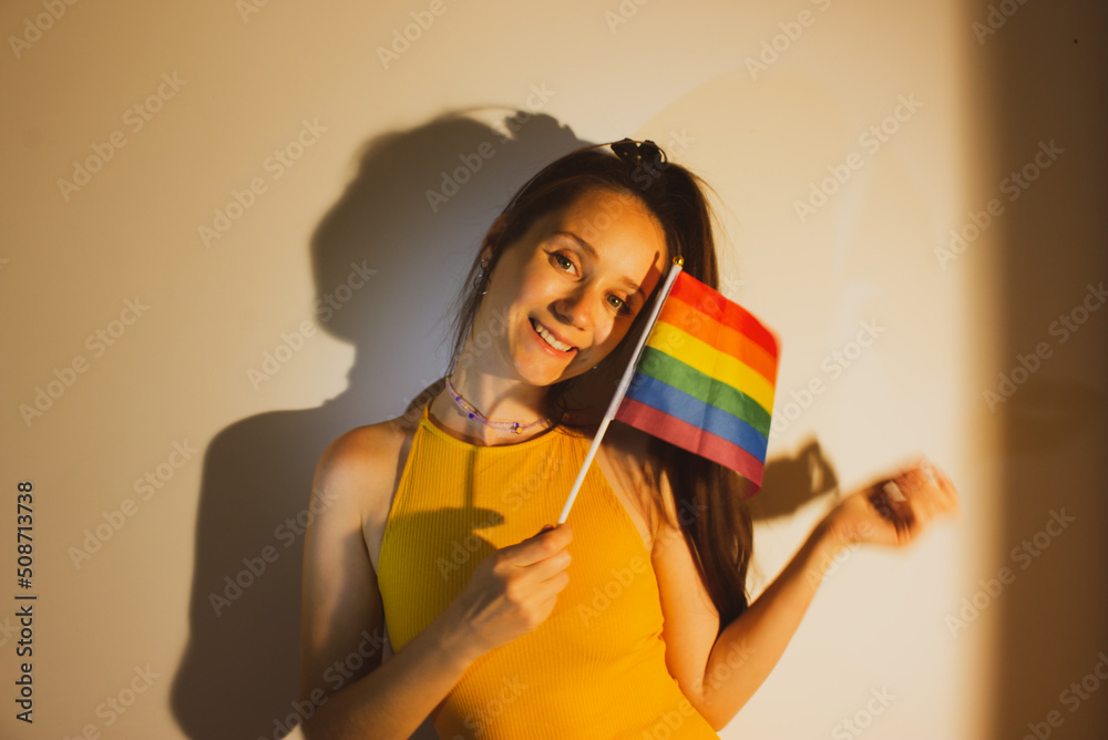 Beautiful young woman, girl holding LGBT flag in hand celebrating Pride Month. Cute sexy girl has fun, smiling, laughing. Rainbow flag - a symbol of lesbians, bisexuals, pansexuals, gays. Coming out.