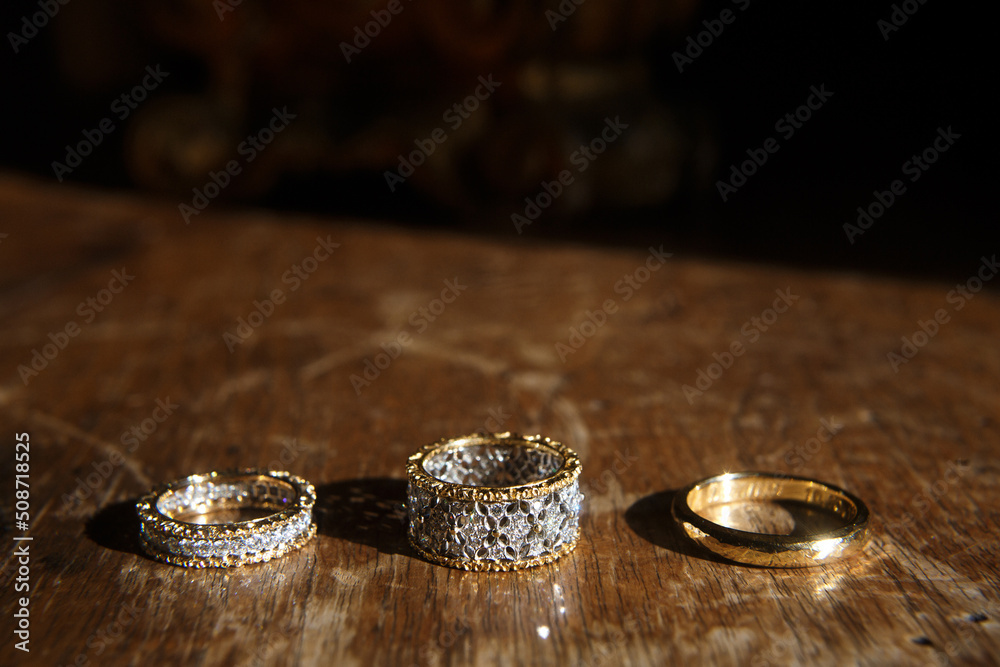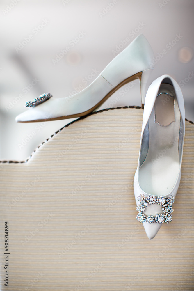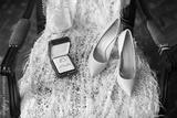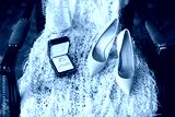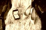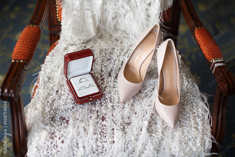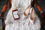 Ivory shoes and rings on a wedding dress