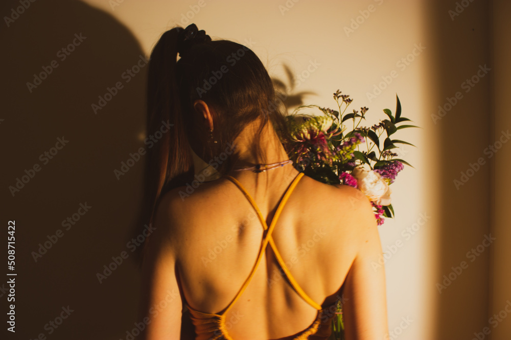 Beautiful girl in open backed dress holding bouquet of flowers back view. Faceless woman in dark shade. Enigmatic lady in summer sundress. Female beauty concept. Celebrating holiday, Congratulations.