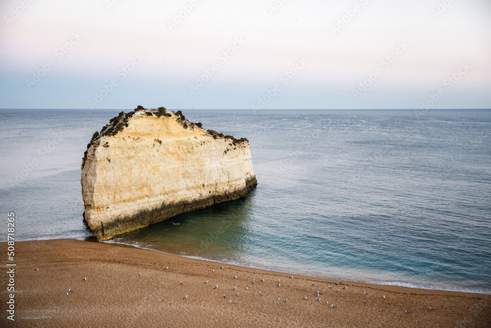 Rock formations near beach and seagulls