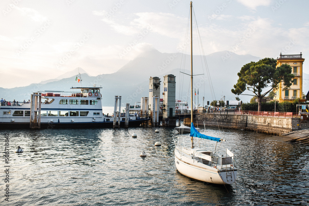 Sailboat and passenger ship near the pier