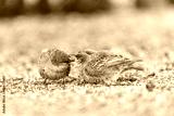 Sociable Weaver bird (Philetairus socius) on the grownd. Feeding chicks.