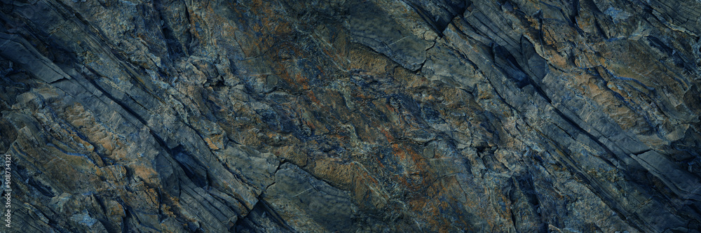 Gray blue brown rock texture. Rough mountain surface with cracks. Close-up. Dark stone background with space for design. Web banner. Wide. Panoramic. Backdrop.