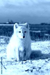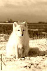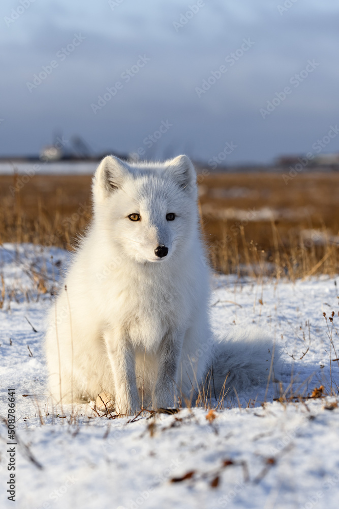 Arctic fox (Vulpes Lagopus) in wilde tundra. Arctic fox sitting.