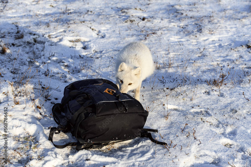Arctic fox (Vulpes Lagopus) in wilde tundra. Arctic fox exploring backpack.
