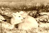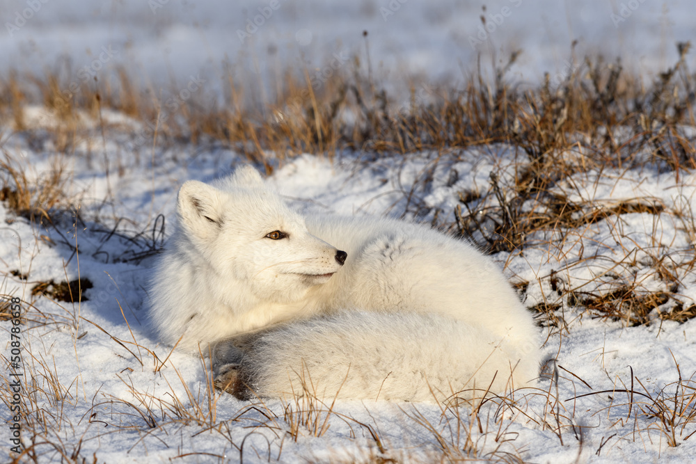 Arctic fox (Vulpes Lagopus) in wilde tundra. Arctic fox lying. Sleeping in tundra.