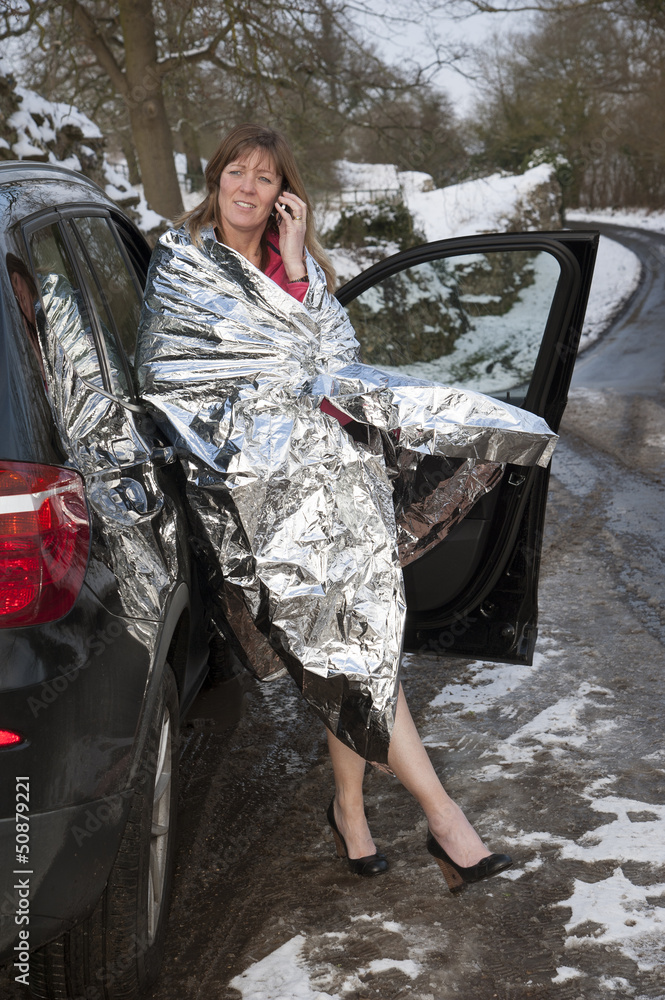 Woman driver wrapped in foil blanket on phone
