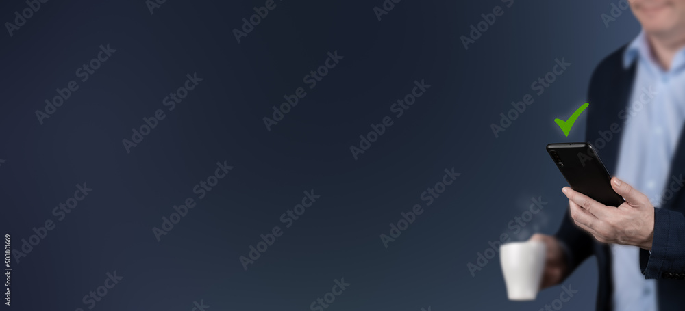 businessman holding cell phone with green tick mark. businessman received confirmation or approval by smartphone. wide blue banner