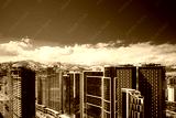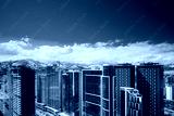New Residential Multi-storey Houses On Blue Sky. Real Estate, Development Industry. highrise houses Elevated View Cityscape Skyline. Light Lighting. Industrial concept. Building industry.