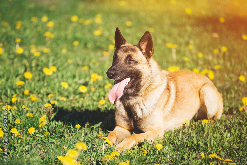 Malinois Dog In Green Spring Meadow With Blooming Dandelion Flowers. Belgian Shepherd Dog Resting In Green Grass. Belge Dog.