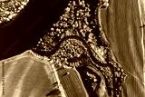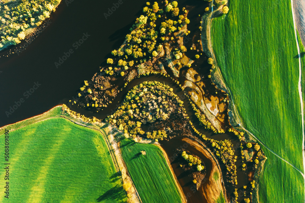 Aerial Flat View Green Meadow, Woods And River Landscape In Sunny Spring Summer Day. Top View Of Nature, Bird's Eye View. Trees Standing In Water During Spring Flood floodwaters. woods in Water deluge