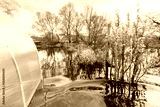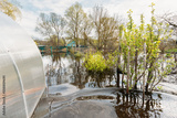 Vegetable Garden Beds In Water During Spring Flood floodwaters during natural disaster. Water deluge During A Spring Flood. inundation River.