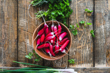 Long breakfast radishes and fresh springtime herbs on wood board
